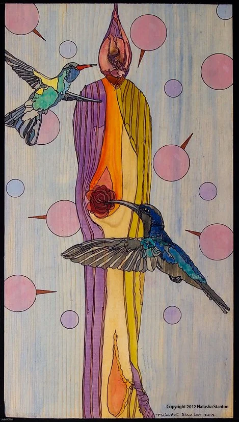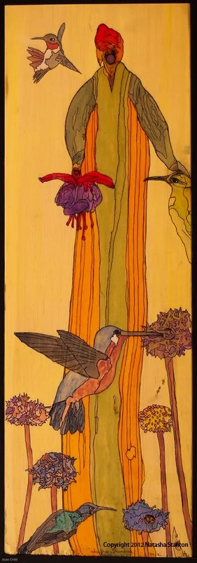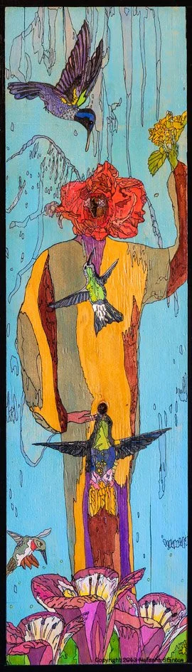 Colorful vertical artwork depicting a human figure with a yellow face, wearing purple and yellow clothing, surrounded by hummingbirds and pink flowers on a striped themed background.