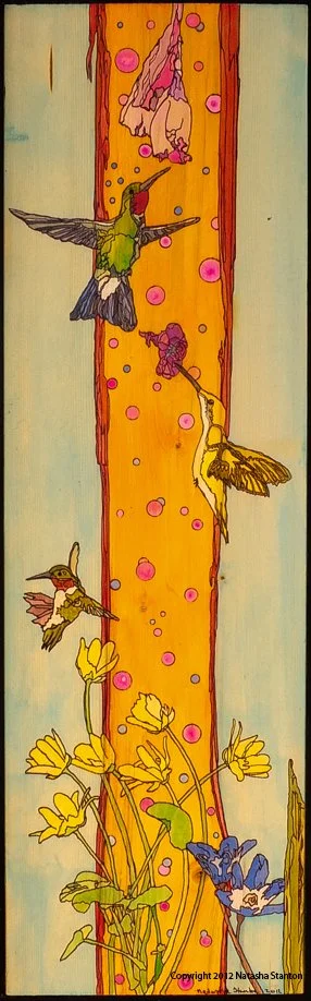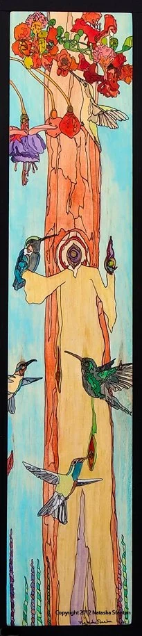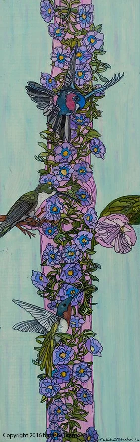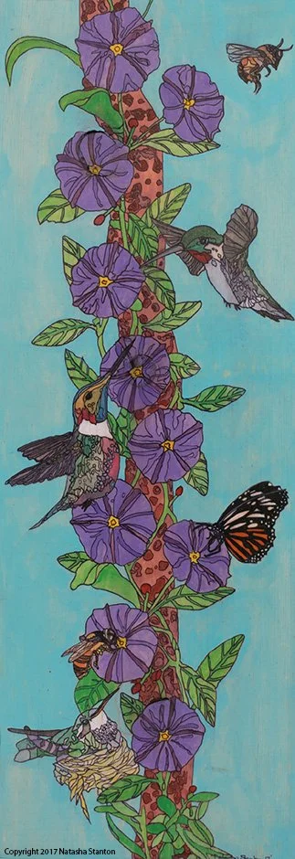 Colorful illustration of a tree trunk intertwined with yellow and purple flowers and vines, with hummingbirds and a butterfly hovering around. View fullsize