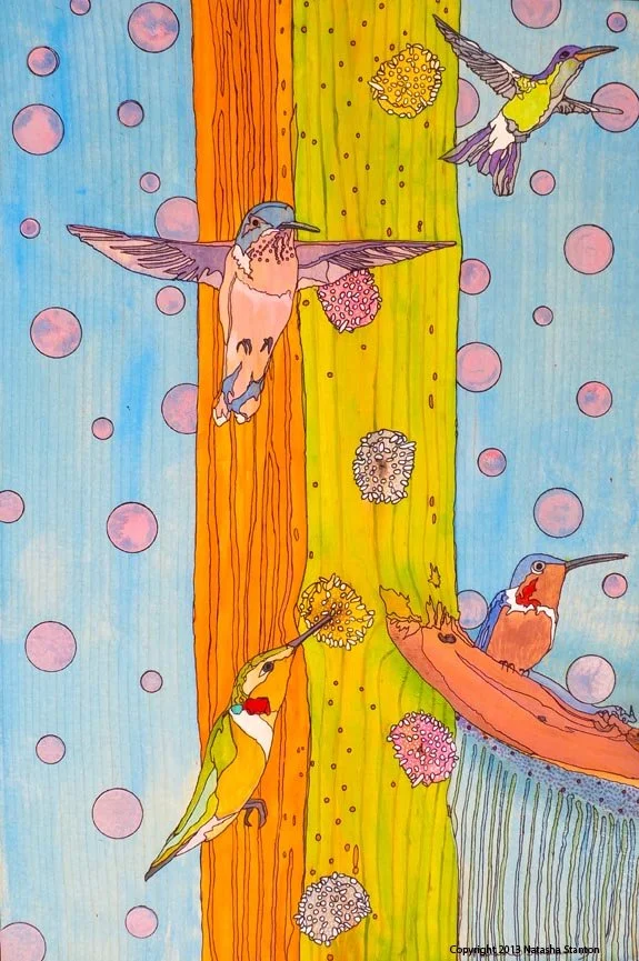 Colorful drawing of four hummingbirds around a multicolored tree trunk with pink and yellow flower-like growths, and pink circles on a blue background.