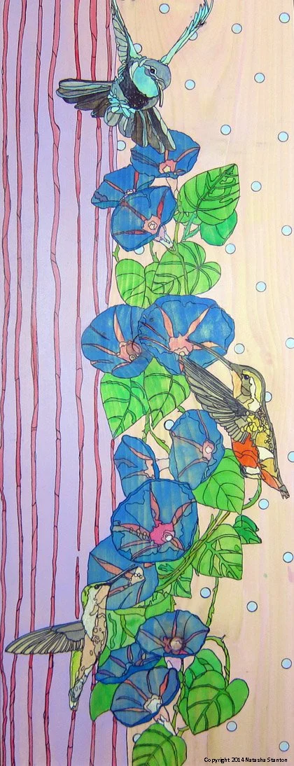 A colorful illustration of hummingbirds and morning glories on a tree trunk, with pink dots in the background. View fullsize