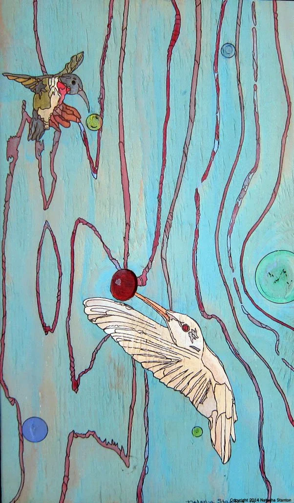 Painting of a hummingbird near a red cherry, with a bee and colored orbs in a stylized background of blue and pink lines.