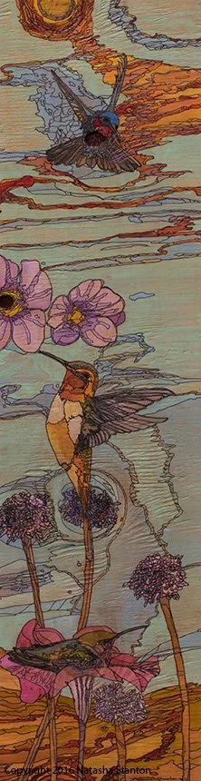 A colorful embroidery artwork featuring hummingbirds flying near flowers and a sunset sky. View fullsize