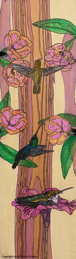 Illustration of hummingbirds and flowers on a tree trunk with pink blossoms. View fullsize