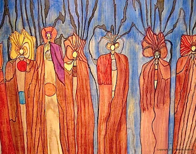Colorful watercolor painting of seven abstract humanoid figures with elongated bodies, standing against a blue background. Each figure has distinctive head shapes and features, wearing long flowing robes.